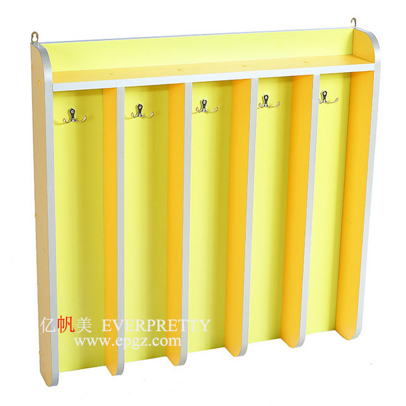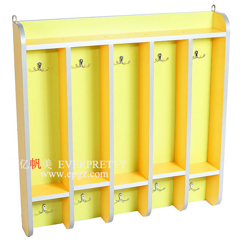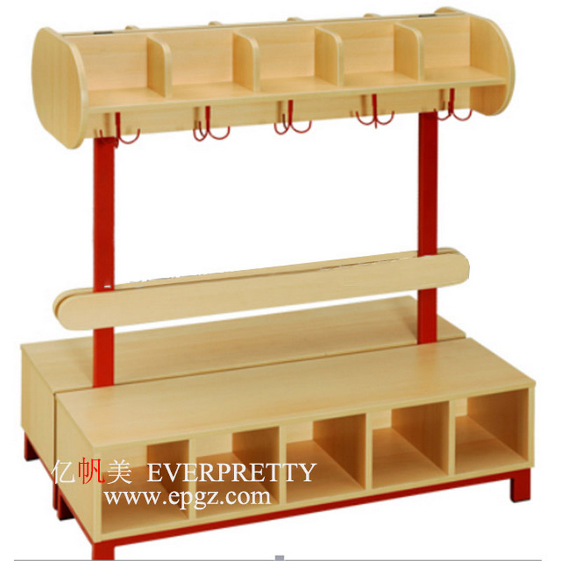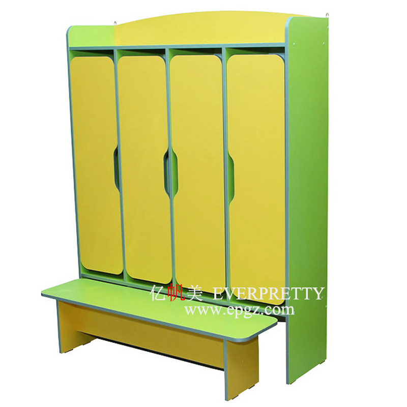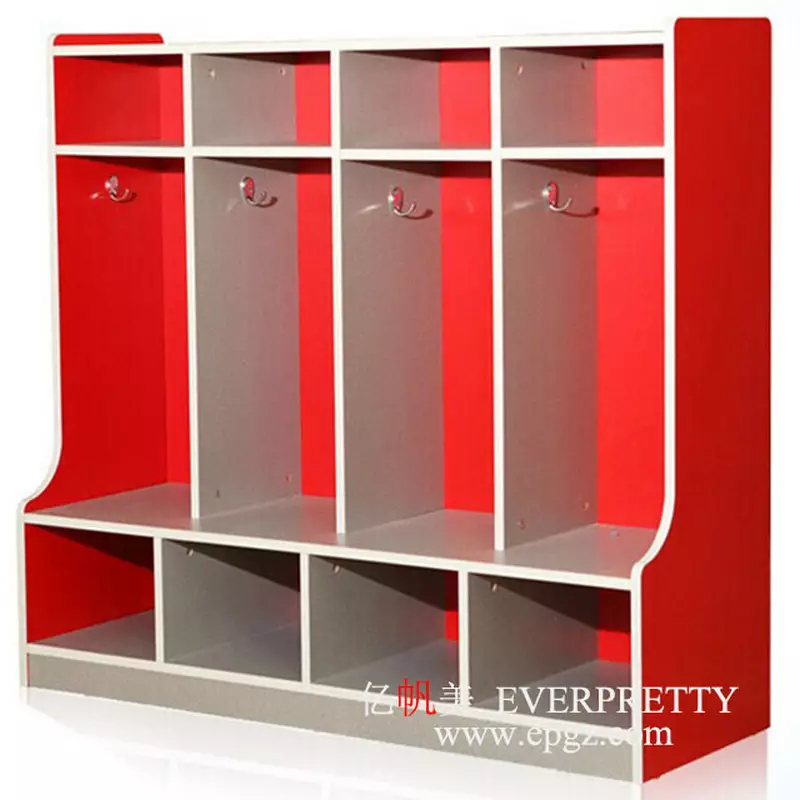 The preschool furniture daycare cupboard is used for clothes and bags storage. The wooden board is HDF with a melamine cover, PVC Edge. You can put your caps or other belongings in the upper cabinet, put your shoes in the lower cabinet, hang your clothes or bags there. Very nice and multifunctional cupboard!