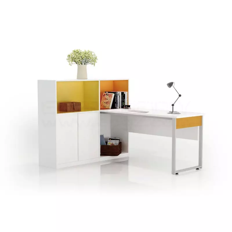 The design of this product is extremely simple, and at the same time has an academic temperament, showing a humanistic feeling. The desktop is made of a 25MM thick solid wood multi-layer board that meets the E0 level of the Asian and European standard board and is made of Acrylonitrile-butadiene-styrene (ABS) plastic with straight edge sealing. The structure is rigorous and the workmanship is delicate. Perceptual frame, firm and sturdy structure, with super carrying capacity, environmentally friendly, durable and easy to clean. This is a table and cabinet with a sense of design and warm colour. It can be used in the office. There is a baffle in front of the table to protect our privacy. The table and the cabinet are connected together. The usual documents, briefcases and other items can be placed in the next cabinet. The cabinet is flat with the top. We can use it to put some plants. In this way, our office will be more beautiful. The colour of the table and the cabinet match, so the overall look is very comfortable and clean. If you like, just contact us.