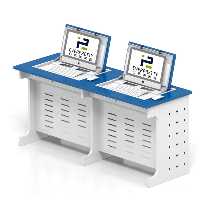With 28 years of experience & 79100sqm land on school furniture, we provide 100% customizable all-around school furniture solutions covering project consulting, bidding, planning, design, sample, manufacturing, delivery, installation, and after-order service. Double computer desk, the main material is 25MM particle board, the desktop can be reversed to store the display screen and keyboard, the bottom of the desk is equipped with a sheet metal wire box, and the front baffle is punched steel plate, the total length is 1500-1700MM.