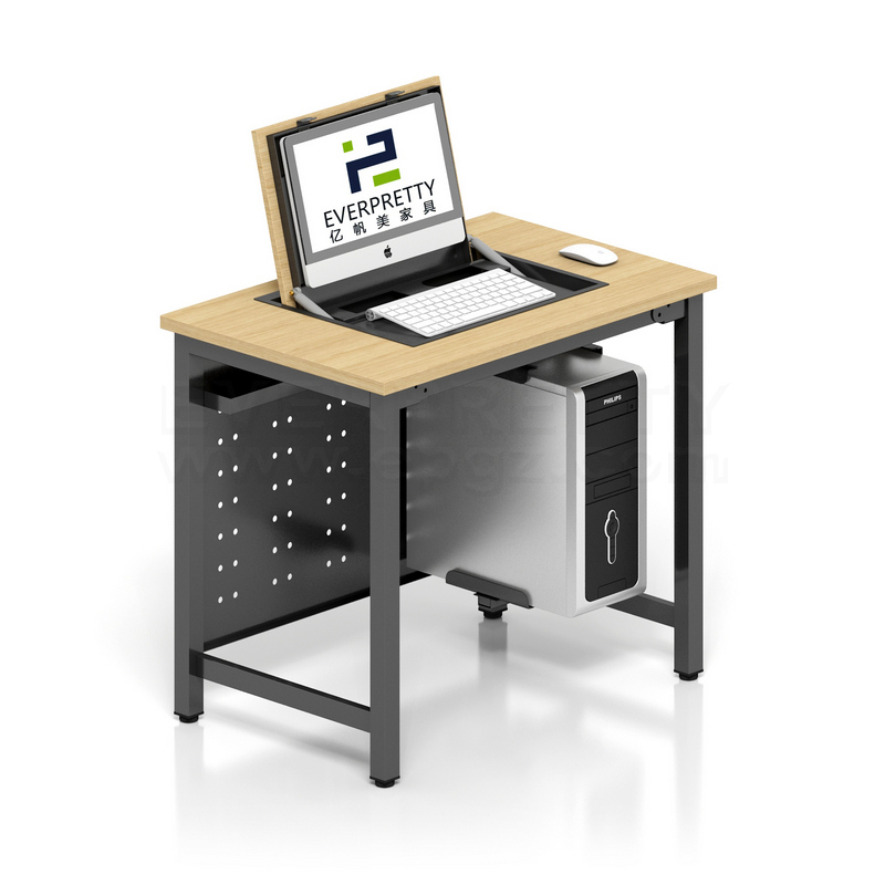 With 28 years of experience & 79100sqm land on school furniture, we provide 100% customizable all-around school furniture solutions covering project consulting, bidding, planning, design, sample, manufacturing, delivery, installation, and after-order service. Single computer desk, the main materials are 25MM particleboard, 40*40 square tube steel frame, the desktop can be reversed to store the display screen and keyboard, the bottom of the table is installed with a hanging cabinet, and the front baffle is punched steel plate.