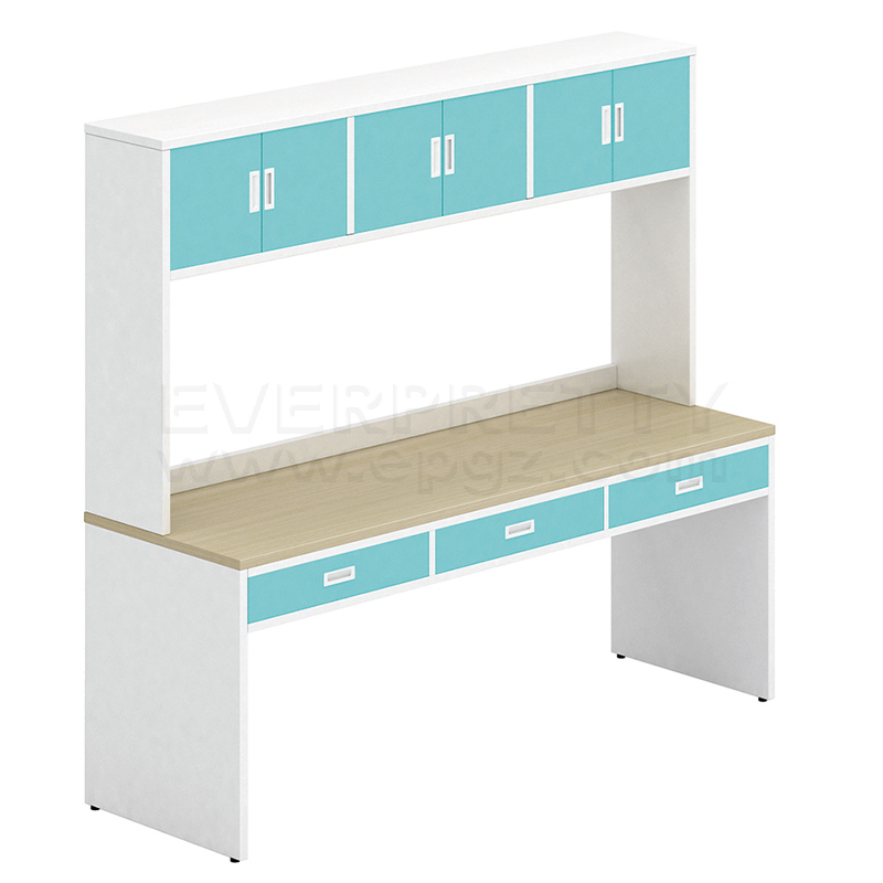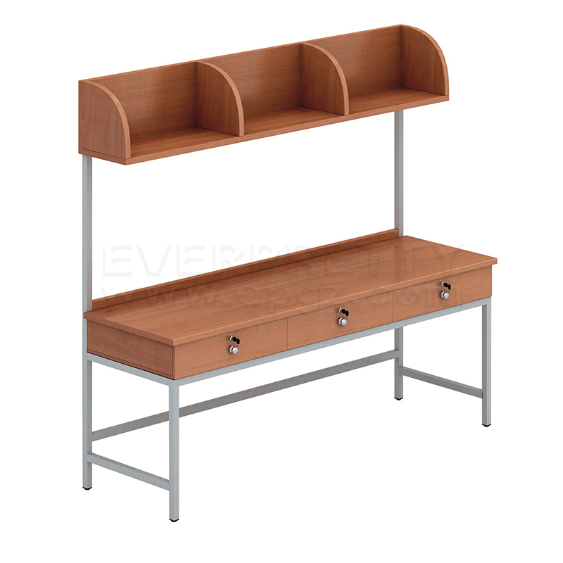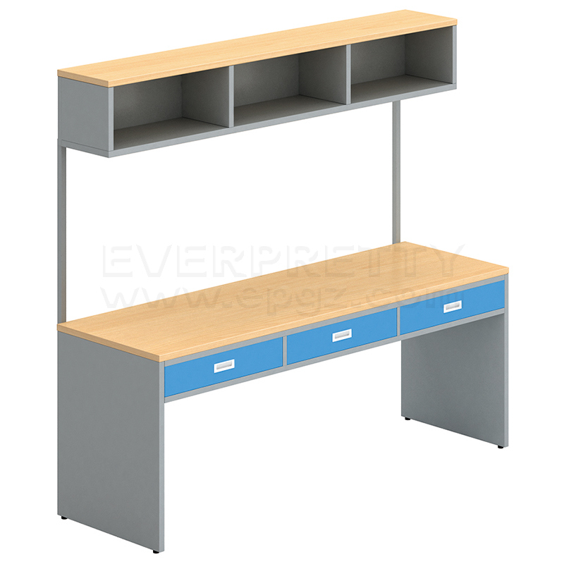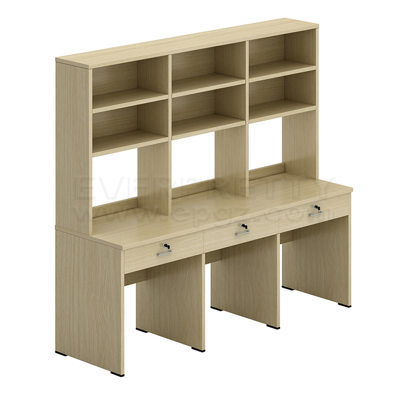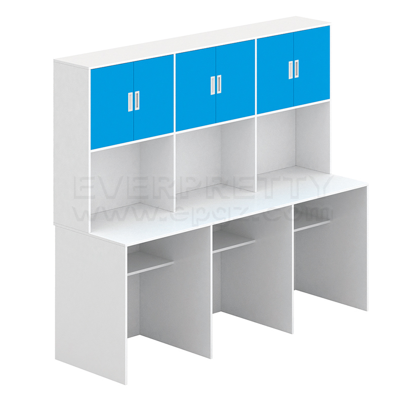 And this one has a little cubicles for each one of you to put your book or something that you want to put. Also, it will get you a small drawer for you(each one of you) to put your bookbag or your other thing. And the wall cabinet and drawer is both made of will use high-density fiberboard(HDF) with melamine board, and it has a good is dirt-resistant, hygienic, and easy to clean. And we use the Polyvinyl chloride(PVC) edge to banding the table and cabinet’s edge, in order to make the edge is flame retardant and also smooth to protect student arm.